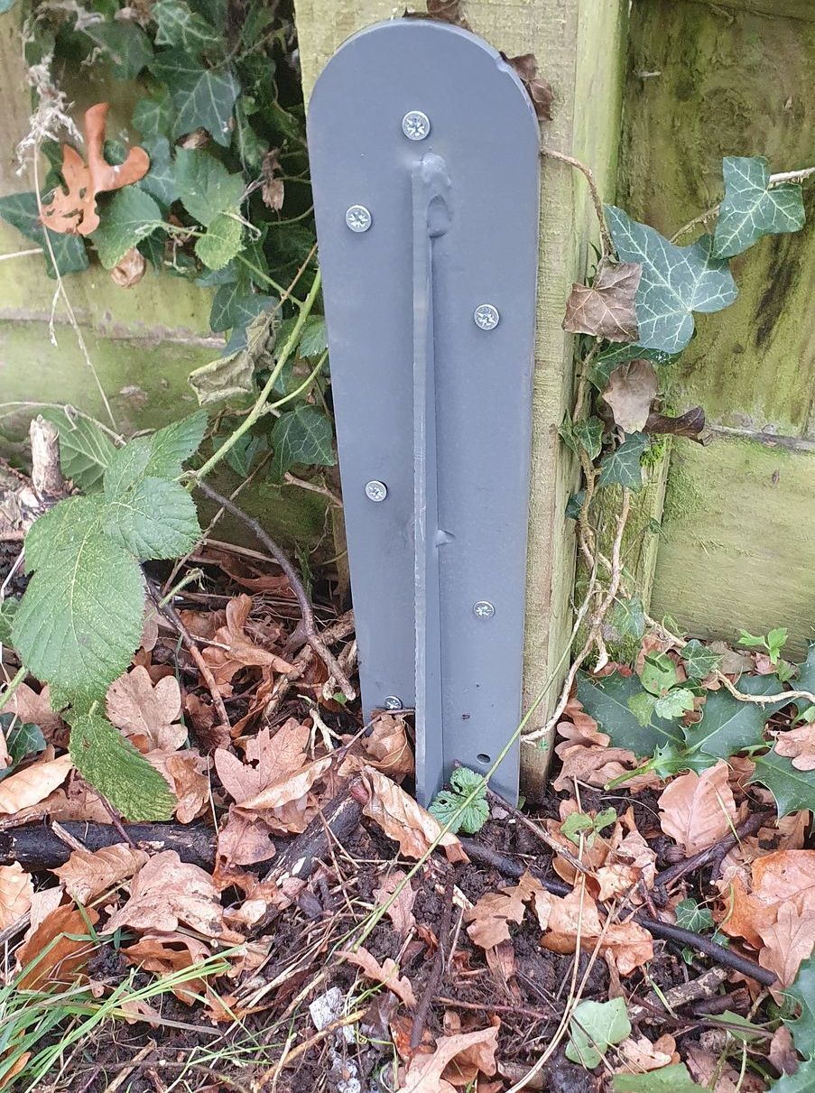 3. Place the top part of the spike flat against the post and using a heavy wooden mallet or a lump/ sledgehammer knock carefully into the ground. The spike will go easily at first and then tighten up when it gets to full depth. Use the screws provided to secure the spike to the post.