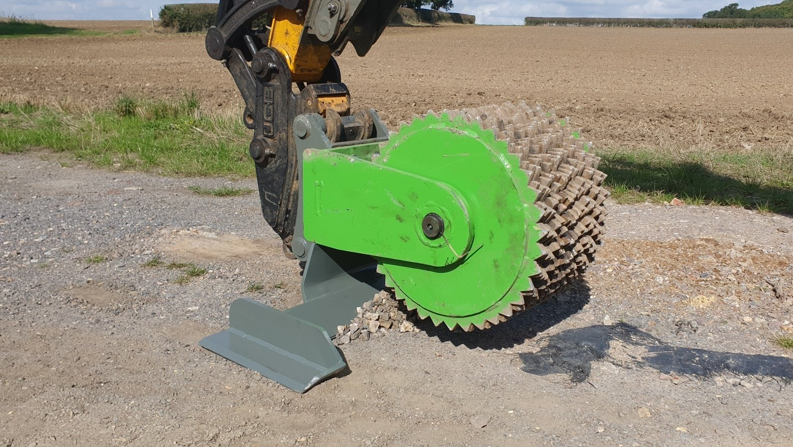 We know the ring style compactor wheel works and works well. Getting the new grader attachment to work with it has been an unexpected challenge. In our yard over the past few weeks i have been trying many variations for the grading beam to get it to grade smoothly with out digging in unless you want it to. We have tried different widths, angles, larger flat areas, smaller flat areas, etc, etc. The current incarnation as shown in the picture tested well in our yard. I was able to scrape the surface around the pothole and successfully level and compact the surface. Great i thought, lets go find some farm tracks. I contacted a farmer friend and offered to repair his potholes which he agreed, so on a nice sunny day i took the digger and had a go. I wish i could say all was good but i as not happy. The grader was too wide! While it worked well in a large flat-ish yard, a farm track with grass in the middle and a camber did not work. I packed up for the day and brought it back to the workshop for further modification. I think we will lose 200mm in width which should hopefully sort the job, i shall find out in further testing. We will have a stand at the midland machinery show on November the 9th and 10th, our first show since covid started. Along with our other kit such as grabs and tree shears i hope to have a finished compactor/grader wheel. We hope to see you there!