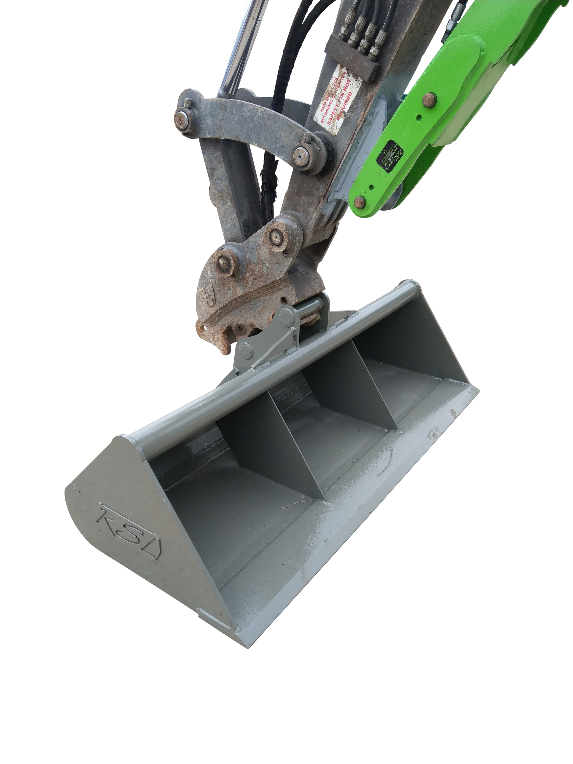 What do we mean by extra? Many people confuse a ditching bucket for a grading bucket and vice versa. They are both shallow wide buckets so an easy mistake to make. A ditching bucket however is more rounded and has drainage holes in the base and sides. As you can see from the picture this grading bucket is not rounded. In fact it has a pronounced flat base that makes it easier to control a flat grade. Also the internal fillets are larger so the bucket can take the weight of the digger pushing on it with out bending the base up. The buckets base is also made from thicker material than a ditching bucket for better wear characteristics. We can manufacture these buckets for any size excavator and any width. If you now realise you need a ditching bucket please contact us!
